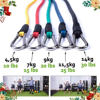 El kit está compuesto por diferentes gomas elásticas que combinándolas puedes alcanzar un máximo de 45 kg de fuerza, un total de 5 cuerdas.